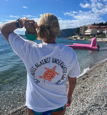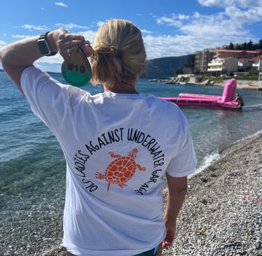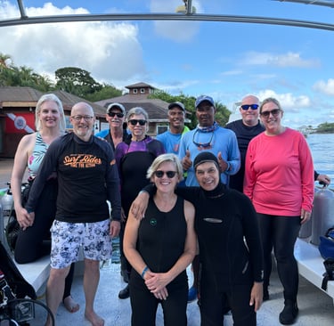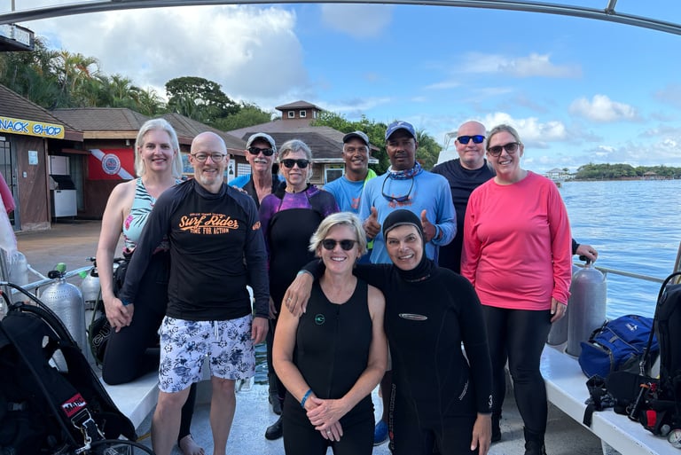 Sue D (front left in center photo) was describing OLAUG on a recent dive trip to Roatán, Honduras. Suddenly the annual pleasure dive spontaneously turned into a trash dive with the boat/dive operator saying he will sponsor one each year!