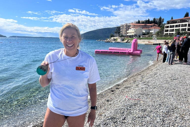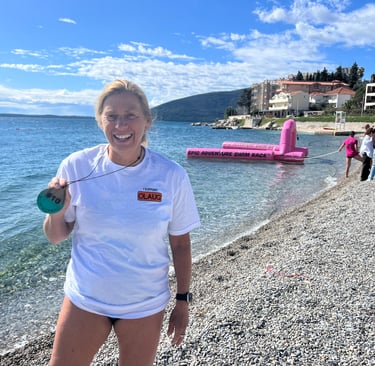 Mary K in Montenegro after she swam an incredible 33.3 km!!